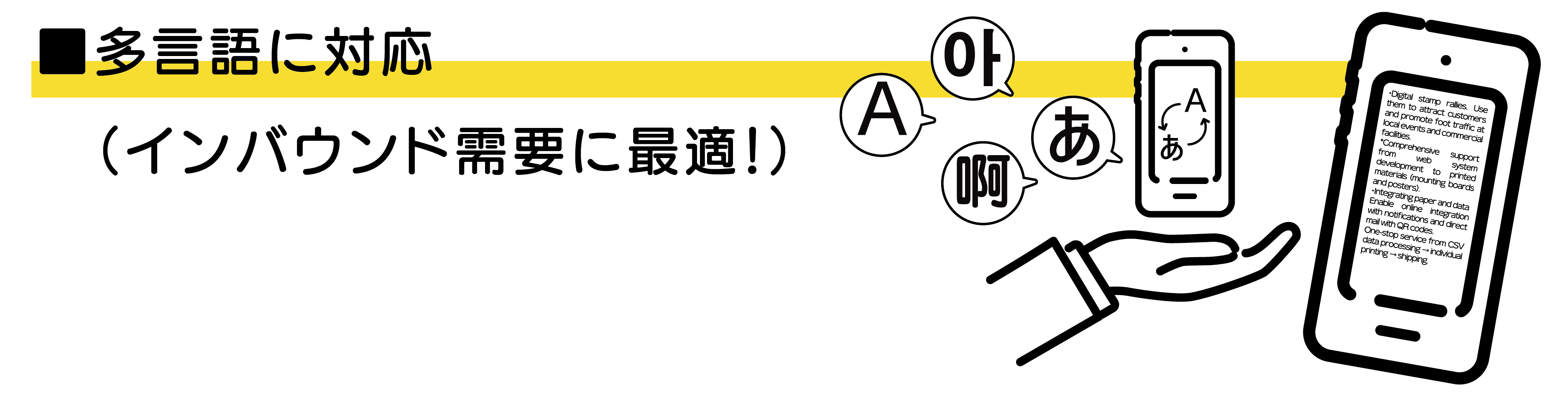 当社では、デジタルスタンプラリーのシステムを自社で開発しています。 紙のスタンプラリーと異なり、参加者の行動ログをリアルタイムで解析できるのが特長です。 さらに、収集したデータを活用することで、次回の企画立案やプロモーションの精度向上にもつなげられます。 多言語表示にも対応しており、訪日外国人を対象としたインバウンド施策にもご活用いただけます。 システム提供にとどまらず、告知物の制作、スタンプラリーの設計・運用、データ分析までトータルでサポートいたします。